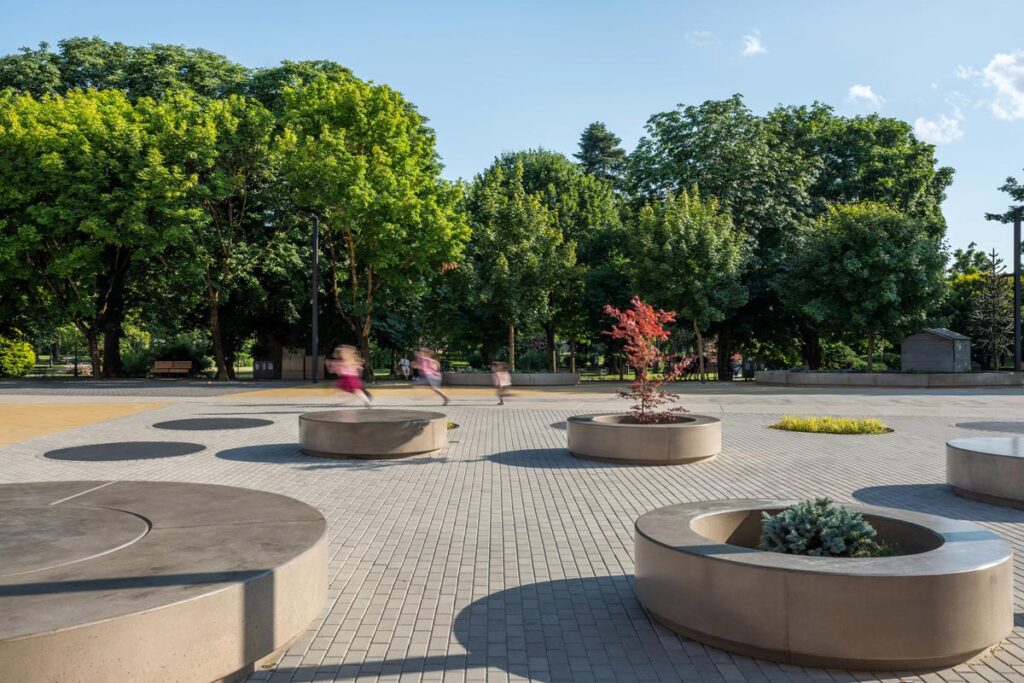 U zoni ispred knjižnice i kina dominira solarno stablo opremljeno wifi-ijem, priključcima za struju te ekranom na kojem se prikazuju meteorološki podaci. Unutar obuhvata postavljene su i skulpture poput postojećeg ali i novog spomenika biciklistima. Od hortikulture korištene su vrste slične onima zatečenima na licu mjesta.