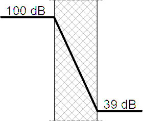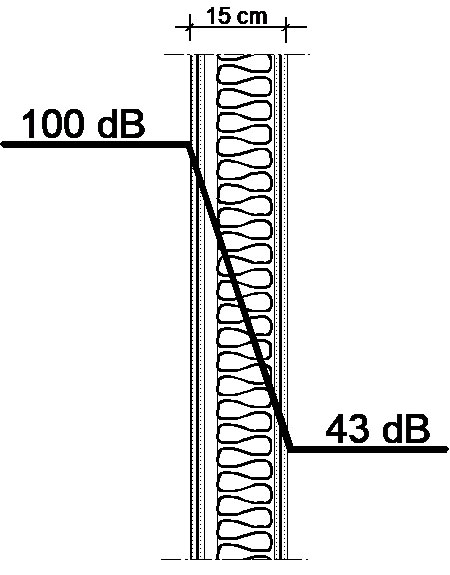 Takav zid prikazan je na slici 2. Kada se jedna njegova strana izloži razini zvuka od 100 dB, kao što je bilo u pokusu s vunom, može se odrediti razina koja će biti s druge strane. Na temelju podataka proizvođača takvih konstrukcija izračunato je da će ta razina biti oko 61 dB.